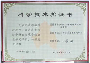 USP-M系列超聲波除垢裝置于2015年獲得牡丹江市人民政府 “科學(xué)技術(shù)一等獎(jiǎng)”獎(jiǎng)勵(lì)